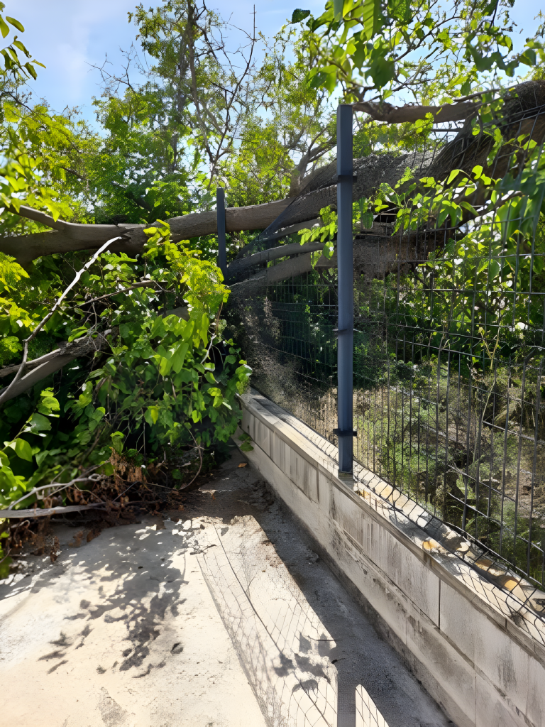 Durante este mes de agosto, hemos estado a disposición de nuestros clientes para realizar actuaciones urgentes que garanticen la seguridad y el funcionamiento de sus naves logísticas e industriales. Un ejemplo de ello, como se puede observar en las imágenes, es la reciente retirada de un árbol caído sobre una valla en una nave de Guadalajara, seguida de su inmediata reposición.